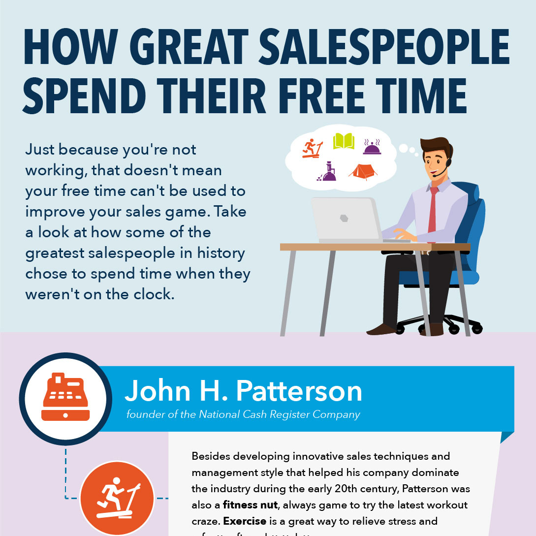 Discover how to spend free time in ways that don't just help you relax, but also help you continue to sharpen your saw, refine critical skills, and increase your value in the workplace. In this infographic, Cydcor shows you how a few sales titans have used their favorite activities, hobbies and interests to help push themselves to the apex of their industries. You'll meet the man whose sales techniques helped shape modern sales and the woman who turned the color pink into big green. You'll learn the greatest sin in sales and see how the greats have even turned their hobbies into record-breaking achievements.